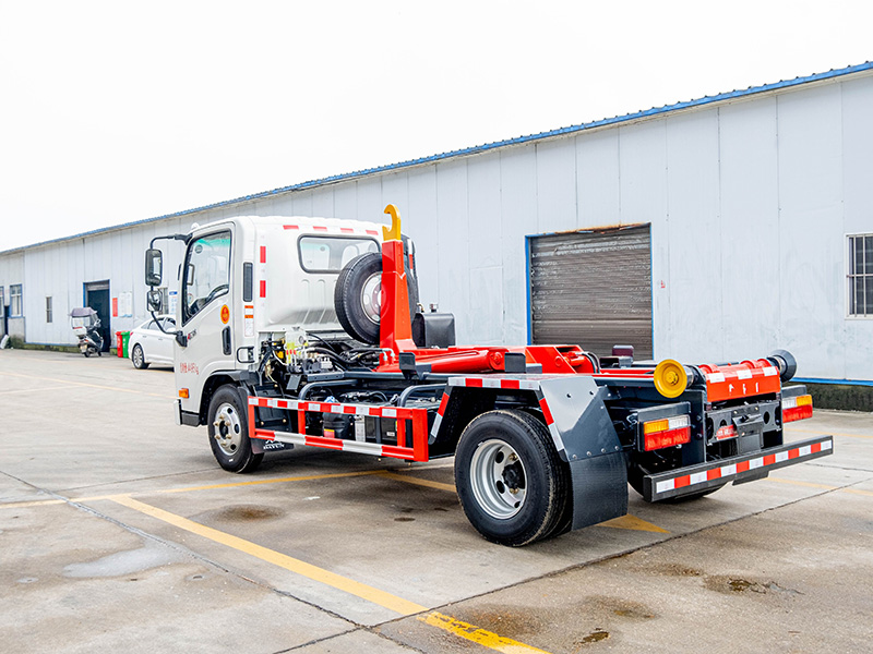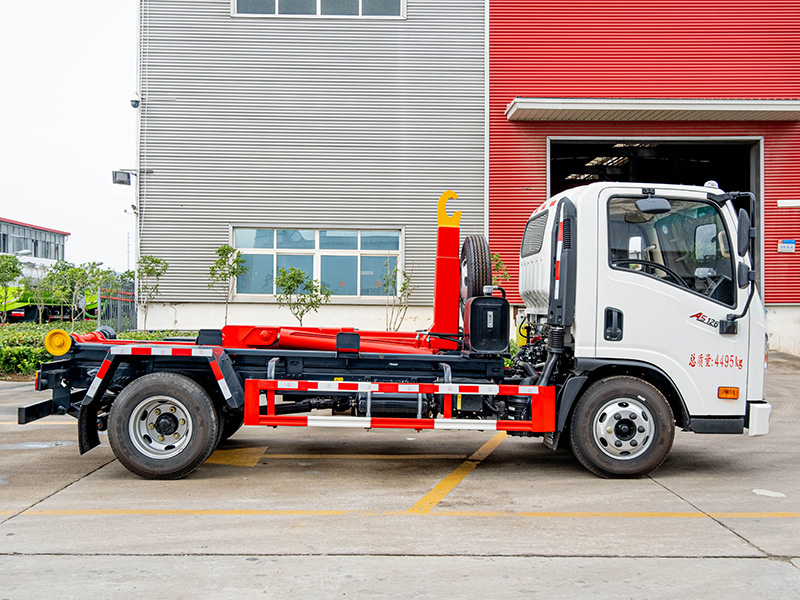 該車可將地下垃圾箱內(nèi)的垃圾及垃圾箱一同拉車上運走同時可自卸,降低了工人的勞動強度。該垃圾車的收運方式是目前世界上廣泛采用的垃圾收運方式,可以實現(xiàn)一車多箱,大大降低了配備成本和空間等等;其專用裝置的功能均以汽車發(fā)動機為動力,通過液壓機構手動或電控來實現(xiàn)。車輛的箱體采用優(yōu)質(zhì)炭鋼板全密封焊接結構,具有強度高、重量輕、不產(chǎn)生二次污染等優(yōu)點。