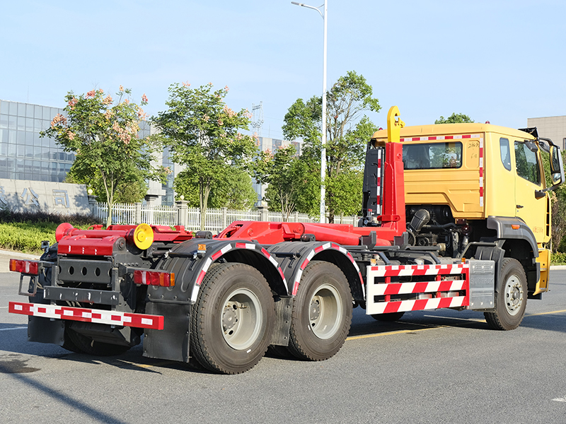 該車可將地下垃圾箱內(nèi)的垃圾及垃圾箱一同拉車上運(yùn)走同時(shí)可自卸,降低了工人的勞動(dòng)強(qiáng)度。該垃圾車的收運(yùn)方式是目前世界上廣泛采用的垃圾收運(yùn)方式,可以實(shí)現(xiàn)一車多箱,大大降低了配備成本和空間等等;其專用裝置的功能均以汽車發(fā)動(dòng)機(jī)為動(dòng)力,通過(guò)液壓機(jī)構(gòu)手動(dòng)或電控來(lái)實(shí)現(xiàn)。車輛的箱體采用優(yōu)質(zhì)炭鋼板全密封焊接結(jié)構(gòu),具有強(qiáng)度高、重量輕、不產(chǎn)生二次污染等優(yōu)點(diǎn)。